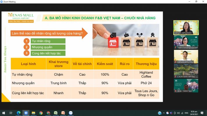 In the morning of September 24th, 2021, IBH Training Academy continued to hold the workshop “New FB Business Model” by Ms. Mac To Nghi – Merchandise Manager and Ms. Nguyễn Thị Minh Thư – Senior Operation Executive of Menas Co., Ltd. The workshop provided useful information about the main business models in the food market, typical examples of each business model and new trends in the field of food business for managers in the FB department of Hospitality Division of SOVICO Group.